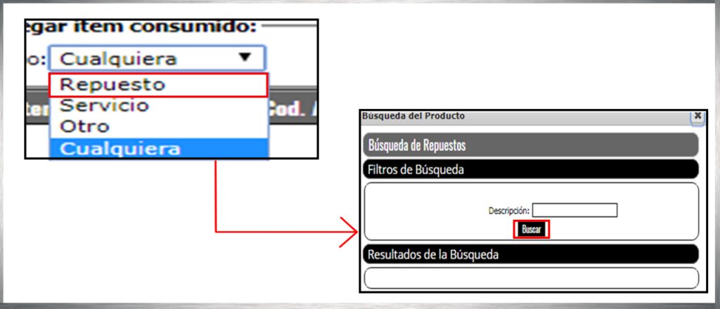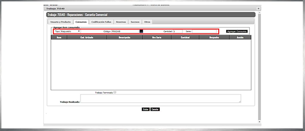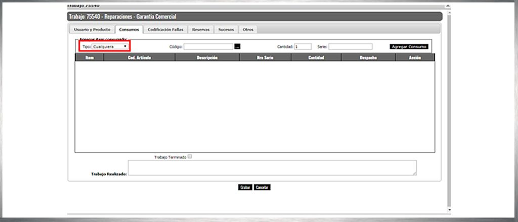 Se desplegaran opciones: “repuesto”: (todos los que se hayan gastado en el trabajo, pueden ser consignados en cuyo caso se deben colocar en “consumos” o “reservados” que son los que tienen que pedirlos en el mismo trabajo, en la parte de “RESERVAS”).