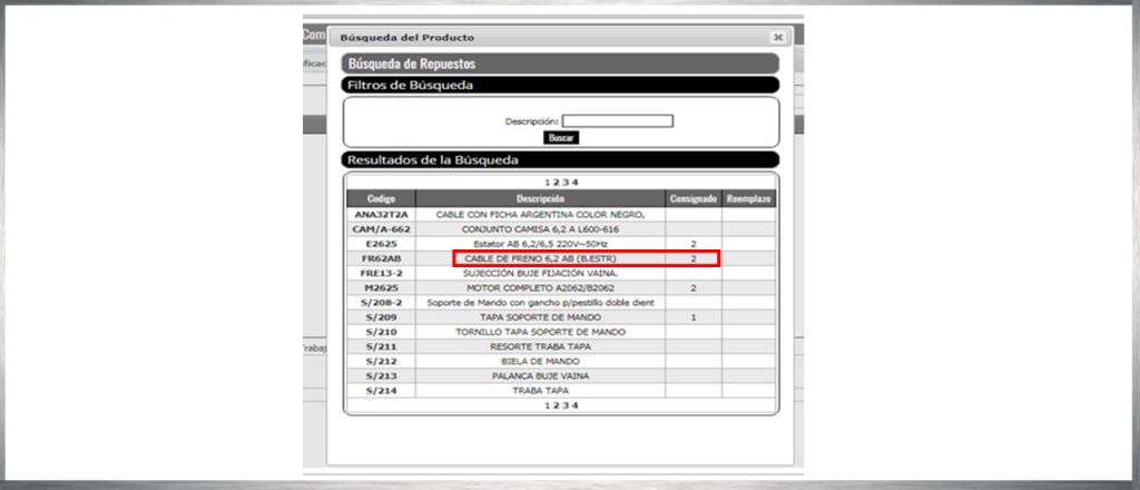 También informa la existencia en su stock de ese repuesto, consignado y en este caso el reemplazo que se puede utilizar. Si aun así no puede encontrarlo, sin colocar ninguna descripción pulsar en “BUSCAR” y aparecerán todos los repuestos que lleva el modelo que está cargado en el trabajo.