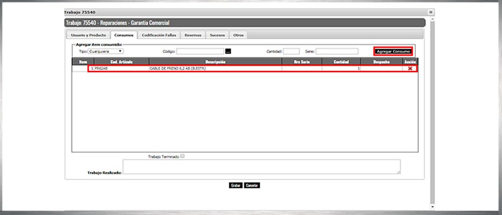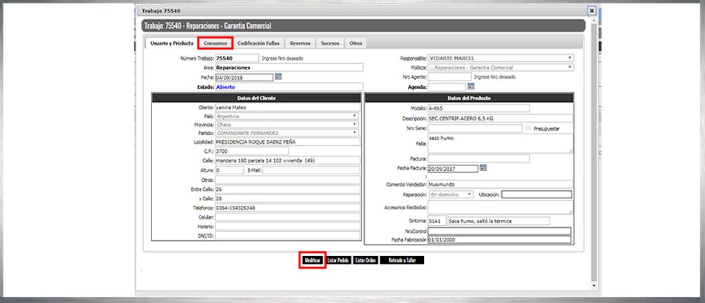 Pulsamos sobre un número de trabajo, se abre la orden con los datos de usuario, pulsamos en “MODIFICAR”, vamos a “CONSUMOS” pulsamos en el cuadro, elegimos “REPUESTO” y pulsamos en el cuadrado de la derecha del rectángulo donde dice “CÓDIGO”