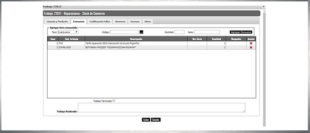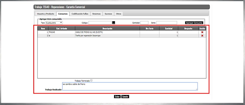 Luego se coloca una leyenda en el trabajo realizado. Se tilda en trabajo terminado, luego se graba y se cierra el trabajo: