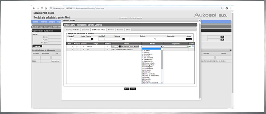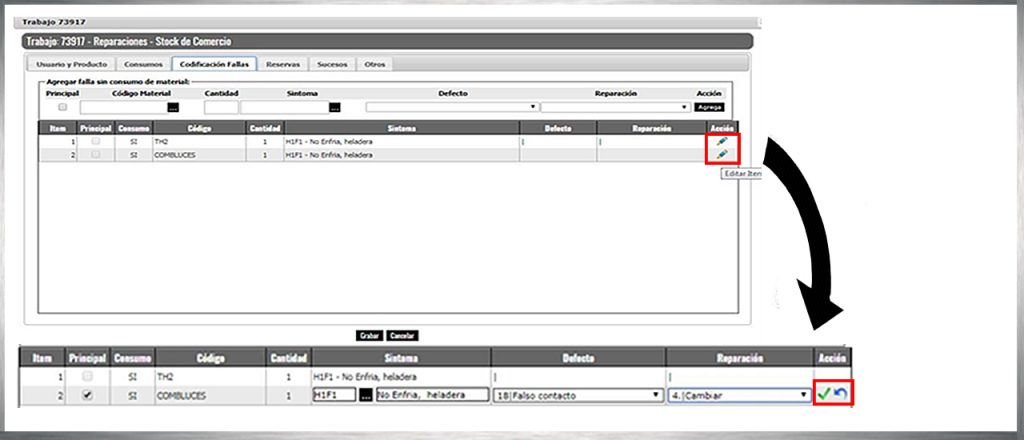 Ahora tenemos que codificar la falla, en este caso tenemos un repuesto, siempre se codifica sobre un repuesto si lo usamos como en la imagen pulsando el lápiz de la derecha, editamos el renglón y esperamos a que se confirme con el tilde verde: