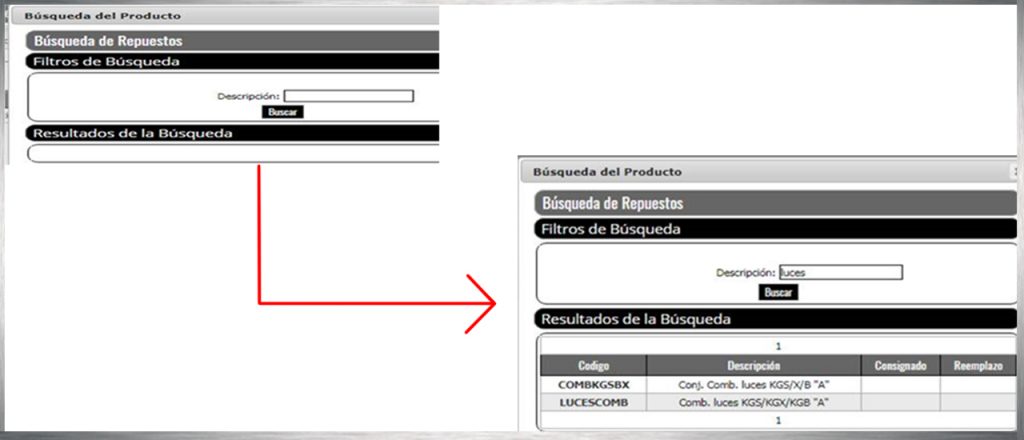 Pulsando en buscar aparecerán todos los repuestos que corresponden a ese modelo, y cuáles de ellos tienen en su stock.