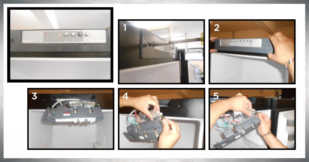 2. Retirar el frente. Detrás se encuentra la botonera que, para poder retirarlo de la guía, es necesario sacar los tornillos del condensador de un de los lados para poder liberar los cables y capilares desde la espalda. ( Fig. 2 y 3)