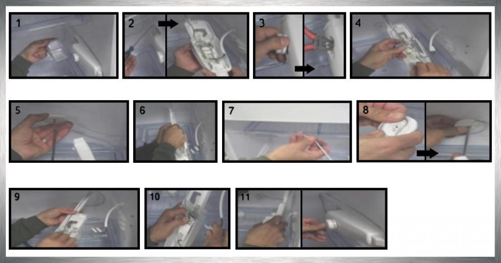 8. Enroscar el alambre del automático siguiendo el dibujo de la pieza plástica del termostato en su parte interior. Luego presentar en la ubicación correspondiente y atornillar sobre la pared posterior de la heladera como estaba ubicada originariamente.