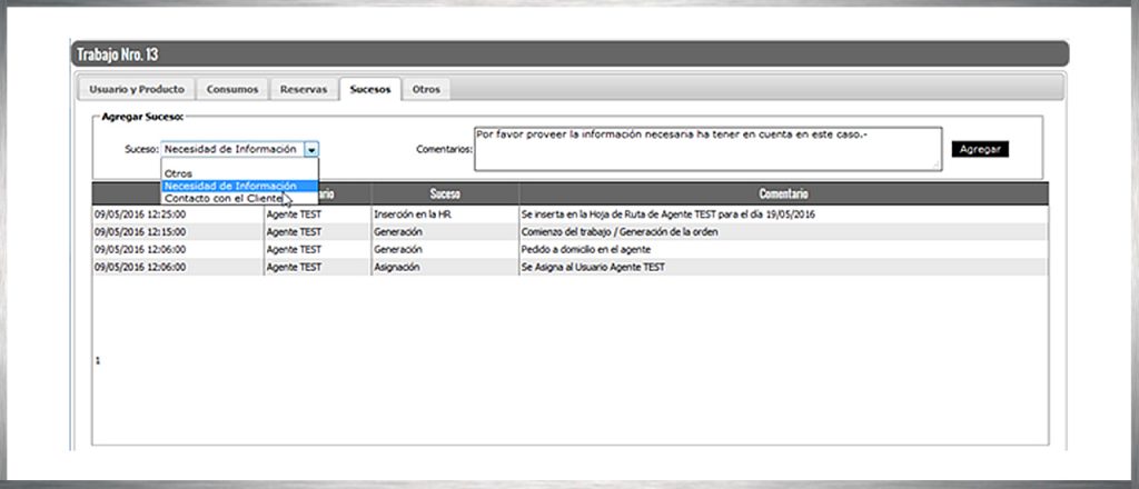 Podrá generar sus propios “sucesos” seleccionando en la lista “suceso” el concepto que represente su necesidad de información, comentando en el campo comentarios todo lo que crea necesario y útil para informar. Luego, presionando el botón “agregar”, podrá incluir en el suceso en el trabajo. Esta acción generará una alerta que deberá se atendida por personal de AUTOSAL.