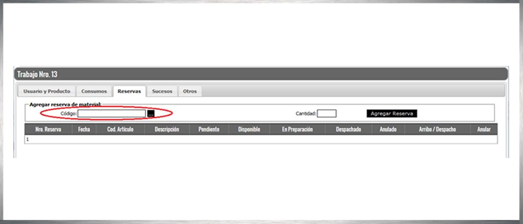 Mediante la hoja “reservas” podrá solicitar y “reservar” los materiales que necesite para llevar adelante la reparación. Llamamos a esto “reservar” pues si contamos con disponibilidad del material, este será “reservado” para usted y nadie más podrá hacer uso del mismo. Esto es una forma de garantizarle que una vez que usted vea que su pedido de materiales tiene “asignada” la mercadería, solo deberá esperar el arribo de la misma.