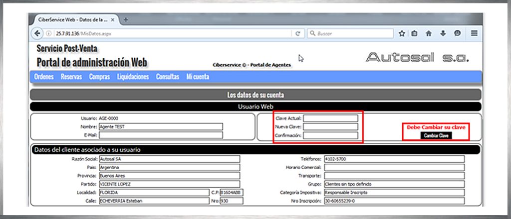 – Al ingresar por primera vez, se le presentará una ventana como la siguiente, en la que podrá cambiar su clave por la de su preferencia. Aquí verá los datos de su cuenta. En caso de que detecte errores u omisiones en los mismos, agradeceremos se comunique con nosotros para informarlo y lograr su corrección.