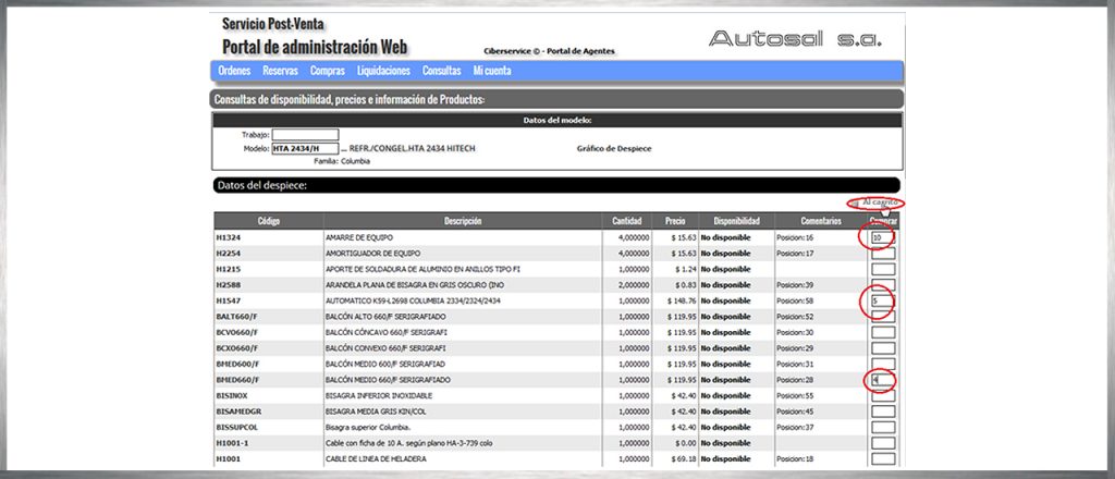 Presione sobre el código a solicitar para incluir el mismo en la solicitud. Luego de ingresar la cantidad que necesite, presione el botón “agregar reserva” para enviar la solicitud a Autosal.