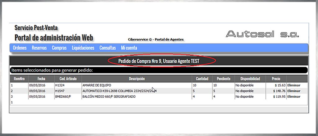 Encontrará aquí todos los materiales enviados “al carrito” durante su sesión de compras y presionando el botón “enviar pedido” podrá formalizar el pedido a Autosal. El sistema le asignará un número de pedido con el cual dar seguimiento a la operación.