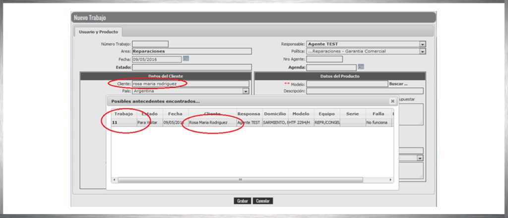 En este ejemplo, se ingresó el nombre “Rosa María Rodriguez” y el sistema muestra una ventana donde se muestra que en el trabajo 11, se ha serviciado a esta persona. Haciendo clic sobre número de caso (11), se completarán todos los campos del nuevo caso con la información del antecedente seleccionado. Si cierra la ventana presionando el botón “X”, ningún dato será copiado.